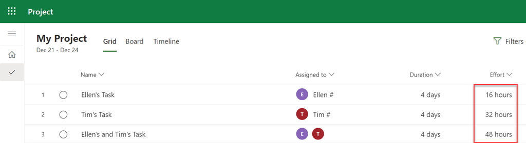 So, for Ellen’s Task Effort is 16 hours (4 days * 4 hours per day – from 09:00 AM to 01:00 PM). For Tim’s Task Effort is 32 hours (4 days * 8 hors per day – from 09:00 AM to 05:00 PM). Finally for Ellen’s and Tim’s Task Effort is 48 hours (Ellen’s 16 hours + Tim’s 32 hours),