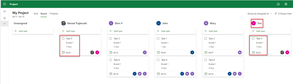 Let’s say that I want to assign Task 5 to myself. The easiest way is to drag and drop this Tasks to the Column with my name, and I will get: