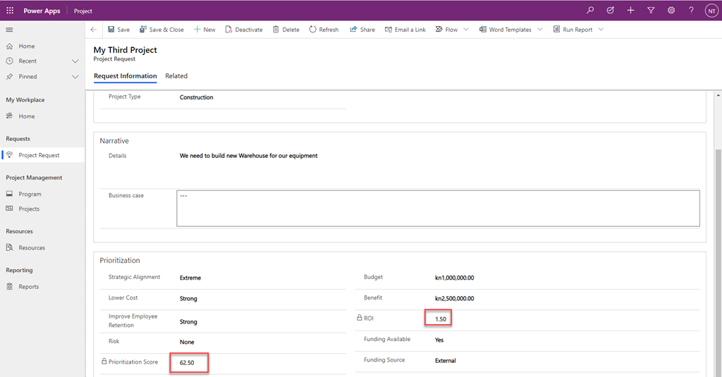 As you can see Prioritization Score, and ROI are calculated fields, so they are visible after saving.