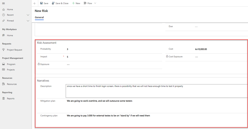 So, I put Probability, Impact, Cost, Description, Mitigation and Contingency Plan for this Risk. Now I will going to save this Risk and I will get: