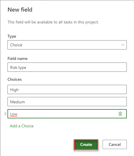 Now, let’s say that I want for each Task have a Risk type: High, Medium, Low. For that I will crate the Custom field following next steps: