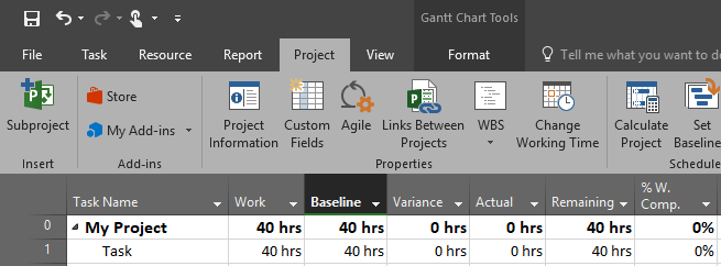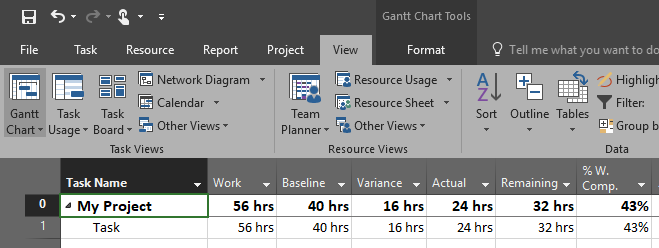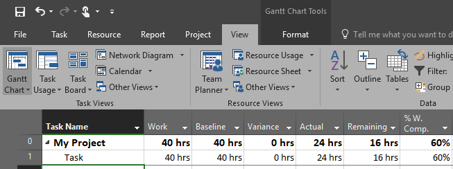 - Then we put 25% complete, which means that Actual work is 8 hours (1 day), and remaining work is 32 – 8 = 24 hours. So far, so good