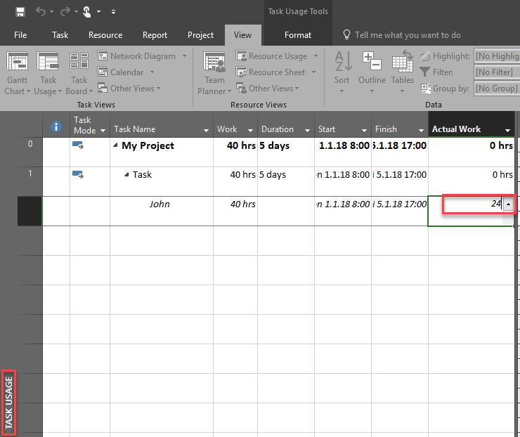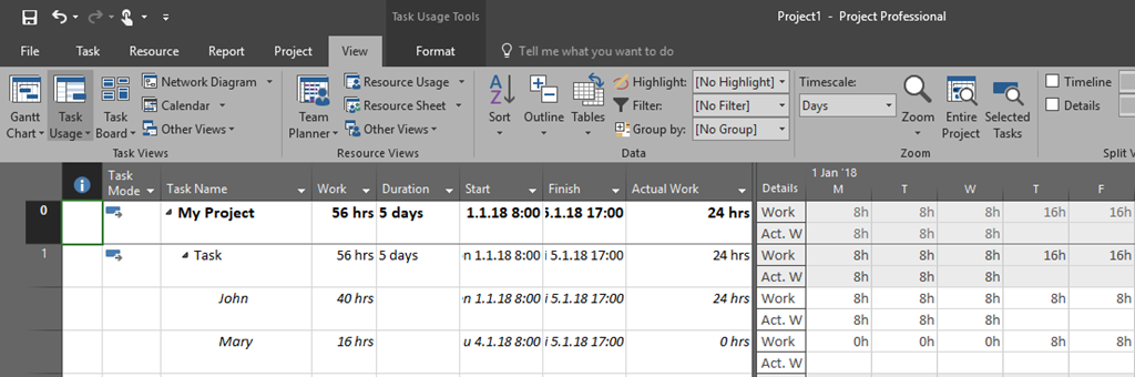 - First we had a Task with 4 days Duration – fixed work, and John assigned to it. It makes TOTAL WORK to be done 4 days * 8 hours per day = 32 hours
