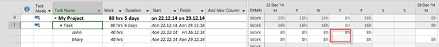 John is suppose to work on that Task 2 day, e.g 16 hours (8 hours per day). But I want for John to work overtime, so I will assign 8 hours as overtime work for that Task: