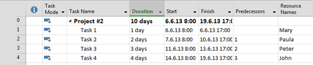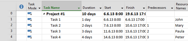 I’ve got what I want! If I now add Task 2 with 7 days duration, and the Predecessor is Task 1, and Mary should work on Task 2, I’ll get: